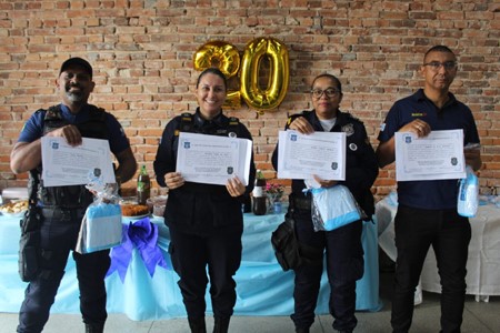 Quatro agentes da Guarda Civil Municipal receberam uma homenagem da prefeitura após completarem 20 anos de serviços prestados à corporação. Num evento que aconteceu na Estação Cultural, o comandante Jorge Ferreira e os inspetores Andreia Barbosa, Thatiane Neves e Robson Medeiros celebraram a conquista de duas décadas à frente dos serviços de ordem pública na cidade. O encontro foi marcado por uma série de homenagens e momentos de interação entre a equipe.