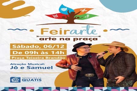 A prefeitura realiza sábado, 6, de 9 às 14 horas, a tradicional feira de artesanatos, a FeirArte. O evento vai acontecer na Praça Dr. Teixeira Brandão, no Centro, e marcará a programação do fim de ano na cidade, levando música ao vivo, artesanato e gastronomia. Nesta edição, a atração musical fica por conta da dupla Jô e Samuel com entrada gratuita e aberta ao público.